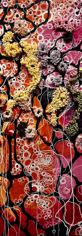 Sticken, Tuften, Weben – Claudia Schwarz nutzt traditionelle textile Techniken, um gebrauchte Stoffe, Papier und Garn in komplexe, reliefartige Bildräume zu verwandeln. Ihre Werke wachsen über Leinwände und Papier– inspiriert von organischen Formen und Strukturen.